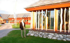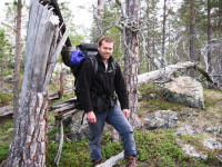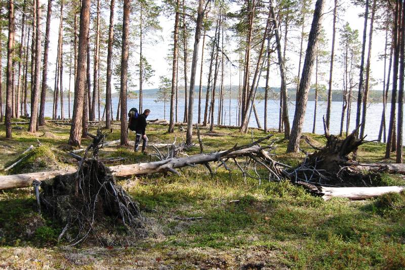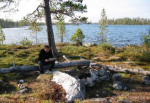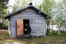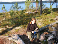 | Pasvik Vi kjørte deretter videre mot Pasvik nasjonalpark. Vi parkerte ved nasjonalparkgrensen, pakket telt og soveposer og litt mat og labbet innover i parken ved halvnitiden om kvelden. En stemningsfull kveldstur i en gammel, trolsk furuskog til rød solnedgang. Vi kom frem til Ellensjøen i 22-tiden. Her fant vi en tømmerkoie som Statens Skoger hadde latt stå åpen til allmenn bruk. Teltet ble dermed liggende uoppakket denne natten. Et varmt kveldsmåltid ute i måneskinn før vi tok kvelden. Lomen skrek over vannene og laget ekte villmarksstemning for oss. Torsdag 25. august: Vi våknet i 7- tiden etter en fantastisk god natts søvn. Det ble en lang frokost ute på holmen utenfor Ellen-koia. Sol, furusus i gammel urskog, stort og ”mystisk” vann, kort sagt et fantastisk sted. Til og med Torstein stresset ned og akseptere at nok en kaffekjele ble satt over primusen før vi pakket sammen. Vi bestemte oss for å komme tilbake hit en gang; til stillheten, villmarksstemningen, den store roen. I motsetning til kvelden før var det lyst når vi gikk tilbake, og vi fikk sett mer av den flotte urskogen; høyreiste furutrær - og gamle døde trær som stod/lå på kryss og tvers. Fasinerende. Her, på den nordvestlige flik av den sibirske taiga, ble det plutselig klart hva vår fremtidig sibirpus måtte hete: Taiga selvfølgelig. Vi kokte oss lunsj ved parkeringsplassen før vi kjørte videre nordover igjen. Første stopp var 96-høyden, hvor vi gikk opp i tårnet og fikk god utsikt mot Nikel på russisk side. Svanhovd miljøsenter var også verdt et besøk. Fine bygninger og et velstelt sted. En fin utstilling med bl.a. utstoppede dyr, og bra film om bjørn. Neste stopp var Bjørnevann, hvor Sør-Varanger gruver hadde satt sitt preg. -Til og med på bussholdeplassene - i hvert fall en. Deretter kjørte vi langs sørsiden av Varangerfjorden via Tana Bru til Vestre Jakobselv, hvor vi tok inn på en liten hytte. Nok et værblåst, fasinerende sted mot havet. Det gjorde godt med en dusj! |  |