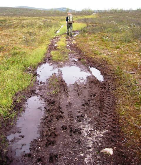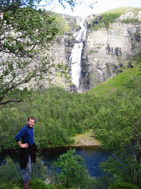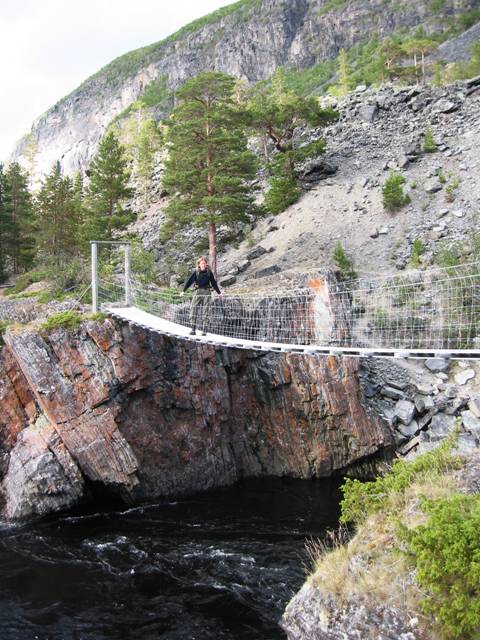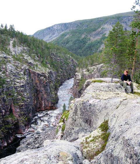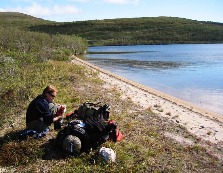 Reisa. Onsdag kunne vi endelig sette nesa mot Reisa nasjonalpark. Dagen startet med proviantering i Kautokeino, før parkering ved stien inn til Raisjavri hytte. Vi startet ved lunsjtider, og 9 1/2 time seinere var vi fremme ved Nedre Foss-hytta hvor vi satte opp teltet i skumringen. Vi hadde tatt oss tid til en halvtime underveis ved Raisjavri, hvor vi spiste middag (en pose hver med Real Turmat - feriens slager). Dagsetappen var på 33 km, og det kjentes. Ikke minst i de to bratte partiene mot slutten. Det hadde vært mye nedbør tidligere i sommer, så to elver måtte passeres barrføt med oppbrettede bukser. En kjølig fornøyelse. Det tok ikke lang tid før vi sovnet den kvelden. Utpå natten viste det seg at Torsteins liggeunderlag var temmelig hullete... Torsdag 18. august tuslet vi de 7,5 kilometerne bort til Mollisfossen. En av Norges høyeste fosser! Tilbake på hytta igjen (kl. 15) spiste vi middag og brukte opp det meste vi hadde av plaster og compeed til plastring av såre bein (et rikt mangfold av vassblemmer). I 17-tiden begynte vi på tilbaketuren. Vi gikk via IMO-fossen, som viste seg å være et vilt og fasinerende område! Ruslet videre opp til ca 550 meters høyde og satte opp teltet i 21-tiden. Dagsmarsjen ble på totalt 26 km, hvorav 15 km uten sekk, eller 8 timers effektiv gange. Det begynte å regne når vi satte opp teltet, og det økte på utover kvelden. Men når vi våknet om morgenen var det oppholds/sol. Vi startet 8.45, og var fremme ved bilen 14.30. Denne gangen vasset vi bare rett over elvene uten å ta av oss på beina. |